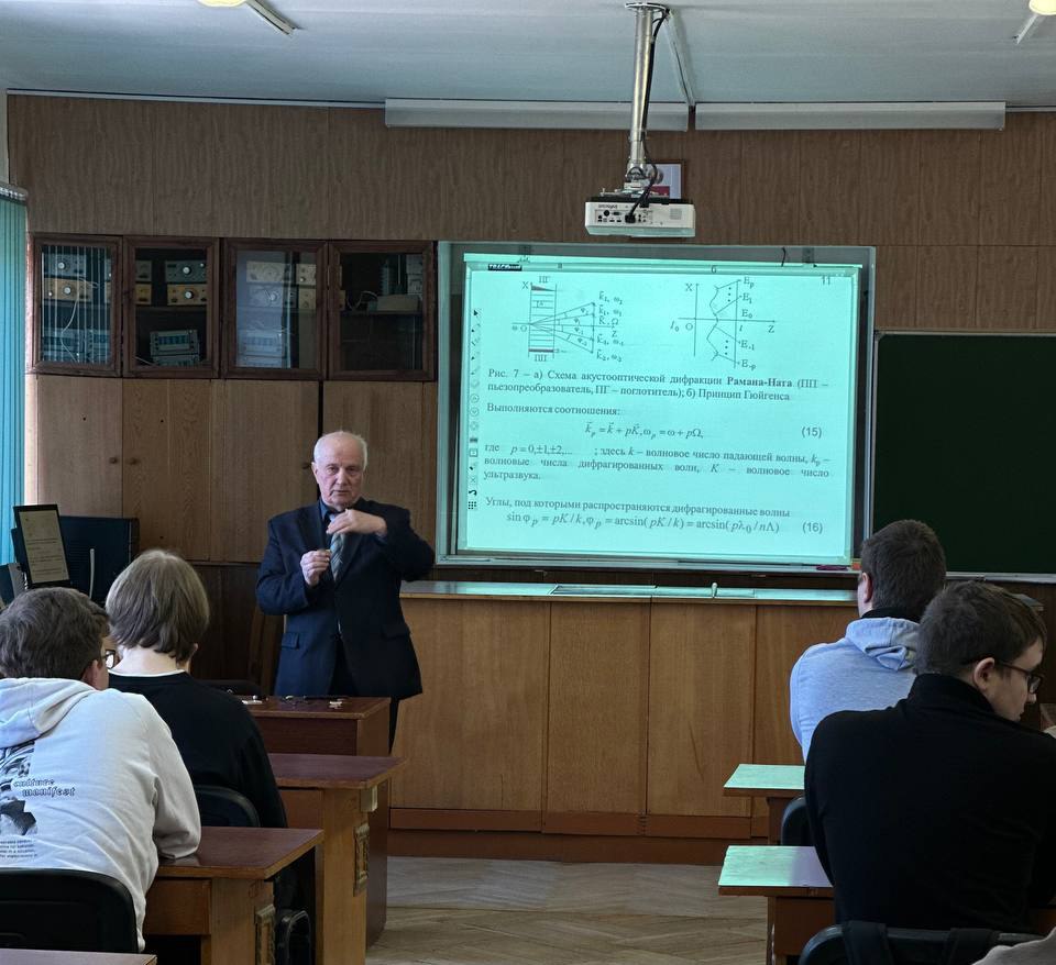 Гость в доступной форме рассказал студентам об основах акустооптики. Он объяснил, что скорость звука в твердом теле подчиняется закону Гука, и различают продольные и сдвиговые волны. Профессор описал, как пьезоэлектрические преобразователи генерируют звук в акустооптической ячейке, где возникают режимы дифракции Рамана–Ната или Брэгга.