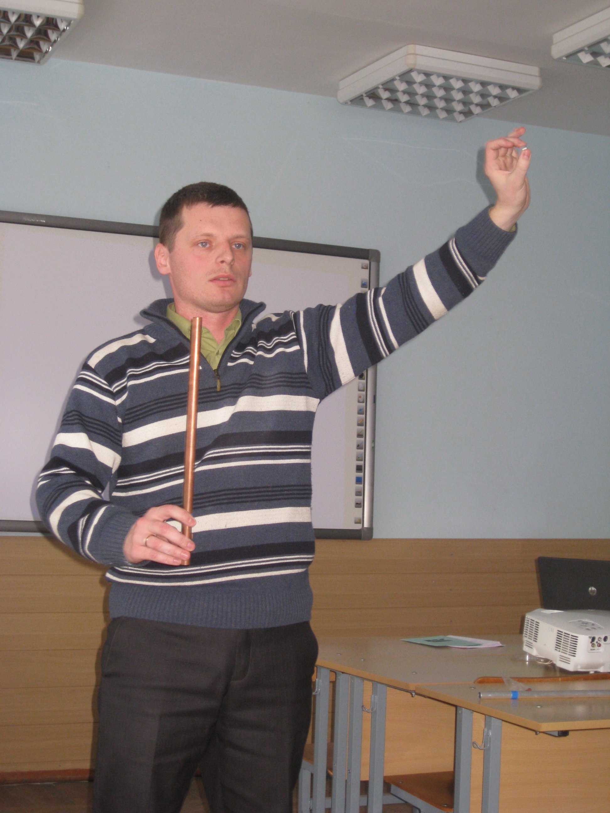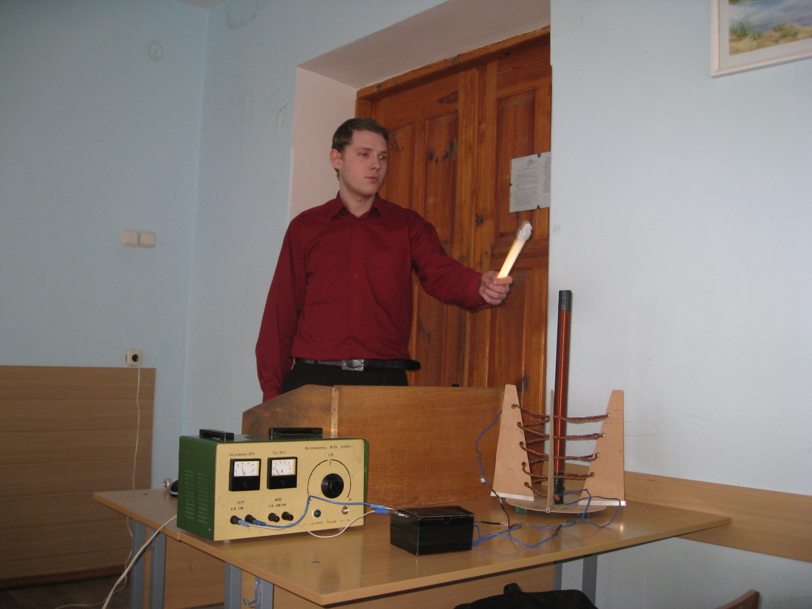 Александр Шкурко поразил всех присутствующих, продемонстрировав прибор «Трансформатор Тесла», выполненный в рамках дипломного проектирования (научный руководитель – канд. пед. наук, доцент Е.С. Астрейко), предназначенный для демонстрации беспроводной передачи энергии электрическим полем образованным высоким напряжением высокой частоты.